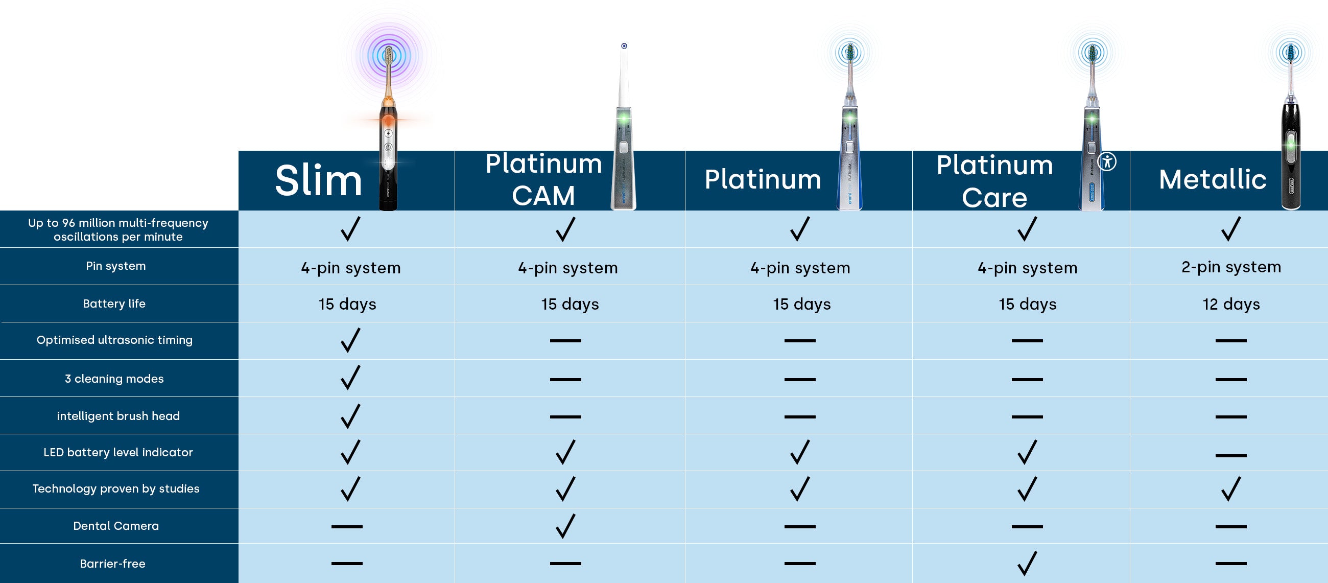 The emmi-dent Metallic ultrasonic toothbrush is the entry-level model of ultrasonic toothbrushes with a 2-pin system. This means that the Metallic model generates two ultrasonic pulses per second, making it a state-of-the-art ultrasonic toothbrush that enables effective yet gentle dental care. With the emmi-dent Metallic ultrasonic toothbrush, you're investing in high-quality dental care at a fair price.