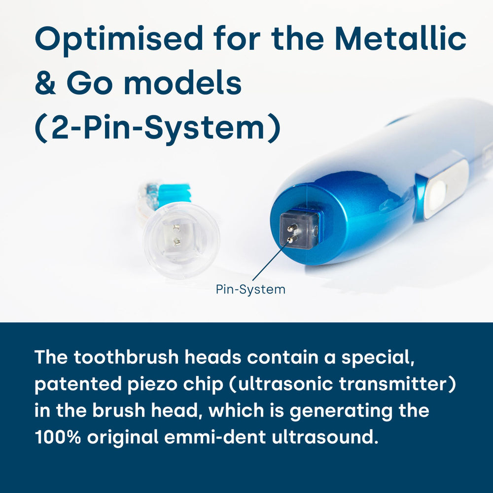 The ultrasonic brush heads of the emmi-dent ultrasonic toothbrushes contain a special, patented piezo chip (ultrasonic generator) in the brush head to generate the 100% original emmi-dent ultrasound. Two hardened contact pins have been integrated into the bases of the emmi-dent Metallic and Go ultrasonic brush heads to connect to the emmi-dent Metallic and Go handpiece. This innovation prevents jamming when plugging in and the ultrasonic brush head can be plugged in and removed easily.