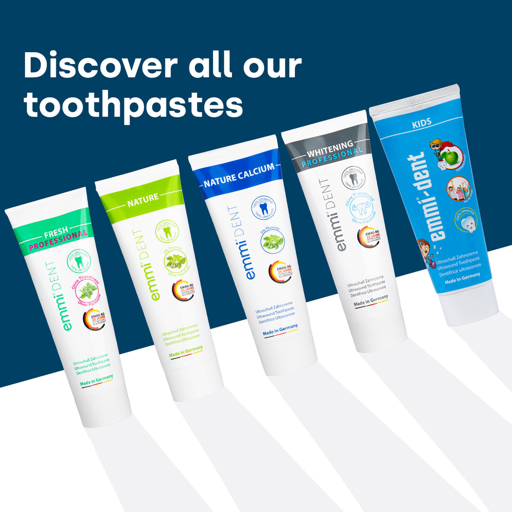 The emmi-dent Fresh toothpaste is ideal for sensitive teeth. It cleans gently, strengthens the gums and fights plaque and tartar. With natural ingredients, it ensures fresh breath and a clean feeling thanks to the revolutionary ultrasound technology.