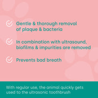 The emmi-pet ultrasonic toothpaste for animals offers numerous advantages that make it an excellent choice for your pet's dental care: Gentle cleaning without abrasion: Thanks to the ultrasound, there is no need for abrasive brushing of the teeth. The RDA value (Relative Dentin Abrasion) is 0, which means that the toothpaste is particularly gentle on your pet's enamel and gums. Effective removal of biofilms and bacteria: The microbubble technology ensures that even stubborn plaque and bacteria are removed without placing mechanical strain on the teeth. Prevention of tooth and gum diseases: Gentle but thorough cleaning preserves the natural protective functions of the teeth, significantly reducing the risk of tooth and gum diseases. Combating bad breath: Regular use of emmi-pet toothpaste helps prevent bad breath by reducing the number of odor-causing bacteria.