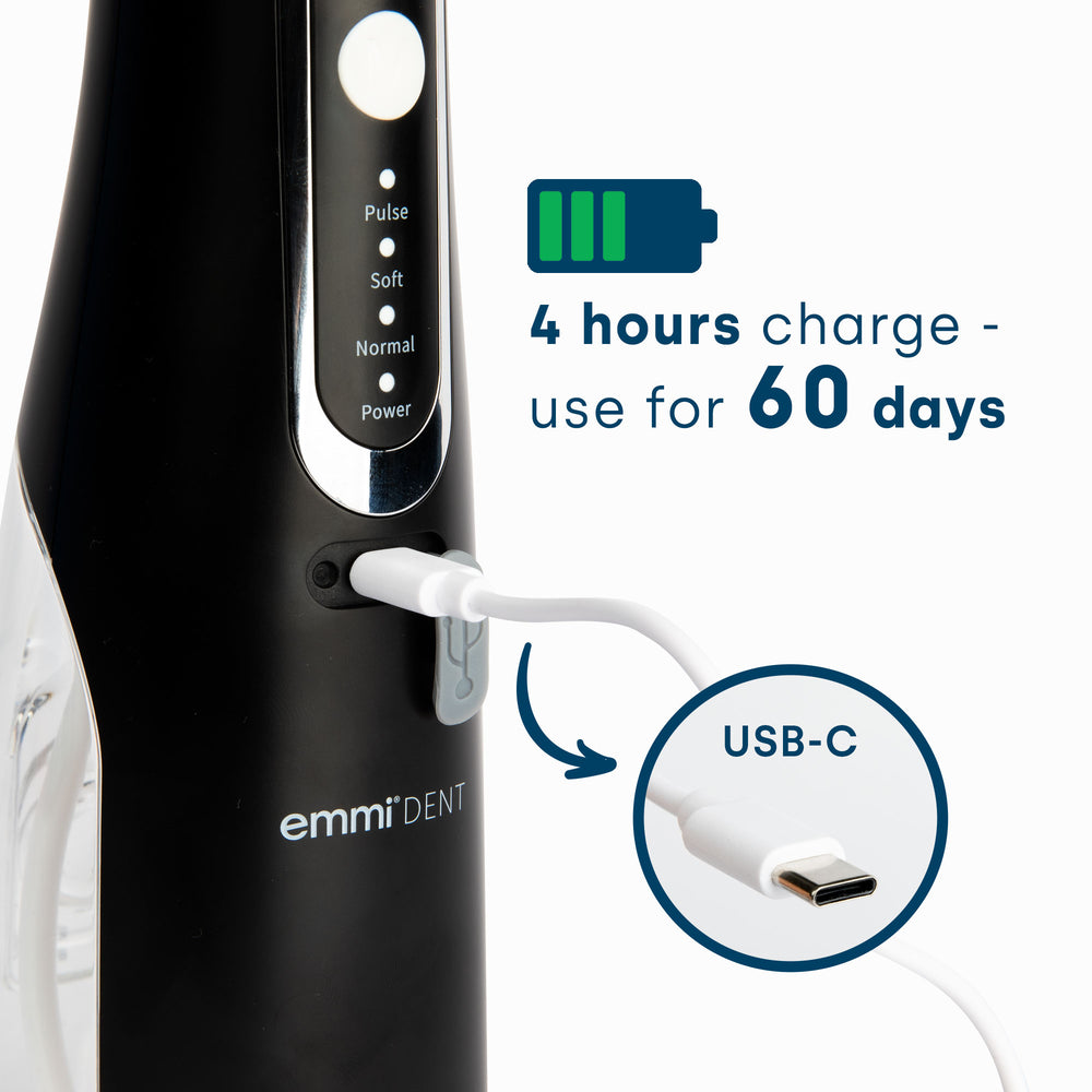 Oral irrigators are available in various designs, from models that are connected directly to the tap and thus restrict freedom of movement through a water hose, to stationary oral irrigators with an external water tank, which are also limited in their handling. emmi-dent has recognized these challenges and developed an innovative solution: a practical, uncomplicated and effective oral irrigator. The emmi-dent electric oral irrigator is characterized by its cordless design, which allows unrestricted mobility throughout the entire oral cavity. Equipped with a generous water tank and an integrated battery, it offers maximum handiness without annoying cables or hoses. Simply fill the tank with water and charge the battery - and the device is ready to go. In addition, the emmi-dent oral irrigator is the ideal companion when traveling due to its compact size. The advantages of the emmi-dent oral irrigator: - Cordless for unrestricted freedom of movement - Compact design, perfect for on the go - 300 ml water tank in the handpiece for easy refilling - Easy charging of the battery with USB-C (charge for 4 hours, use for 60 days) If you are looking for a product that fits seamlessly with your lifestyle and your demands for careful dental care, the emmi-dent oral irrigator offers a tailor-made solution. Developed for users who value thorough and relaxed oral hygiene both at the start of the day and at the end of the evening, it sets new standards in tooth cleaning.