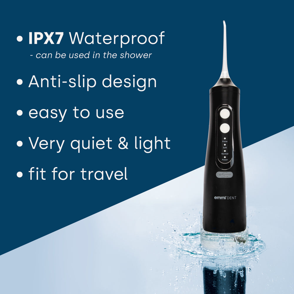 By the way: The electric oral irrigator from emmi-dent has a practical water tank that is simply filled before use. This saves you the hassle of handling cables in your mouth. However, it is important that the water in the tank is replaced regularly and that the tank is also cleaned thoroughly again and again. This way you prevent bacteria from collecting inside the housing.