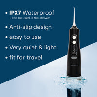 The oral irrigator is waterproof according to IPX7 and can be used at home or when travelling. The integrated 300 ml tank can be easily removed for cleaning. The nozzle can also be easily removed to change the attachments.
