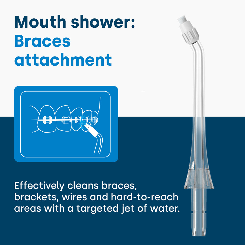 We have the perfect nozzle attachment for every application! With the four nozzle attachments included, you have the right nozzle to hand for every cleaning. Whether braces, bridges or implants, the oral irrigator is ideal for removing deposits in the gaps between teeth or other hard-to-reach places.