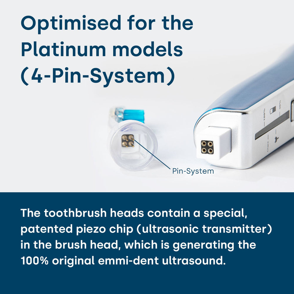 The ultrasonic brush heads of the emmi-dent Ultrasonic toothbrushes contain a special, patented piezo chip (ultrasonic generator) in the brush head to generate the 100% original emmi-dent Ultrasound. In the sockets of the emmi-dent Platinum Ultrasonic Brush Head has 4 contact pins for connection to the emmi-dent Platinum handpiece integrated. This innovation prevents jamming when plugging in and the ultrasonic brush head can be easily plugged in and removed. In addition, thanks to the optimized ultrasonic timing, these are up to 4 times more effective than the brush head of the emmi-dent Metallic.