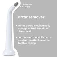 The emmi tartar remover can be used manually or as an attachment for tooth cleaning. It works purely mechanically through abrasion without ultrasound.