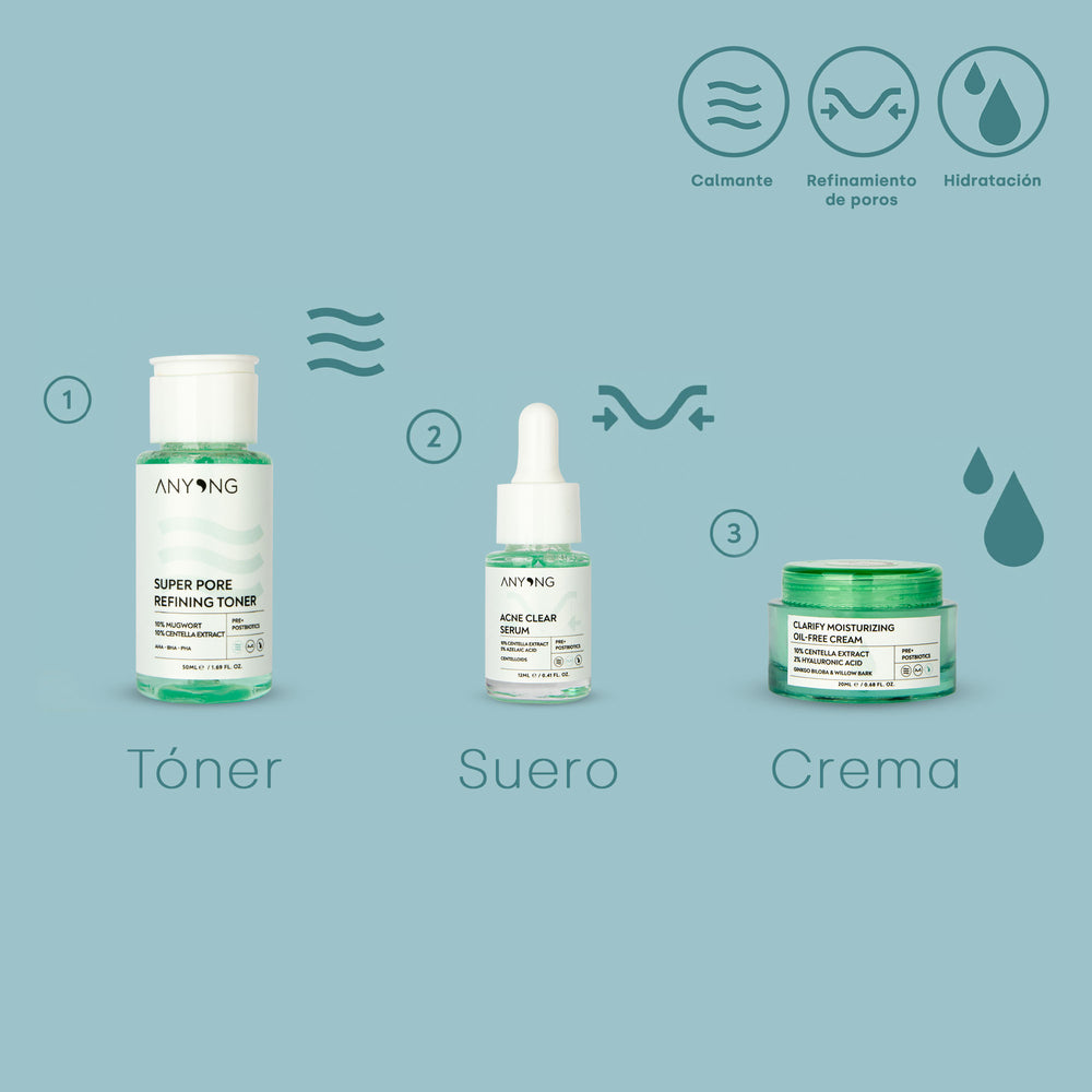 El kit ideal contra las pieles impuras. El tónico refinador de poros elimina el exceso de grasa, lo que lo convierte en un juego previo ideal. Lo más destacado para una piel limpia es el Acne Clear Serum, que contiene extracto de cantella y ácido azelaico. Reacciona específicamente a tus problemas de piel y regenera tu piel. La crema hidratante clarificante y sin aceite proporciona un acabado acogedor.