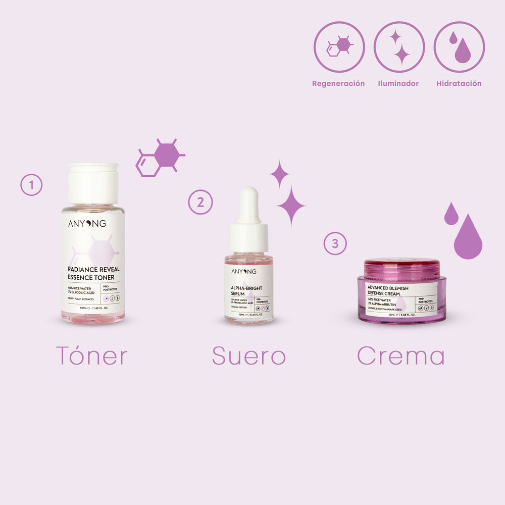 El kit perfecto para una piel uniforme. El tónico suave a base de agua de arroz limpia y cierra los poros, lo que lo convierte en un juego previo ideal. Lo más destacado para una piel uniforme es el sérum alisador y refinador de poros. El toque final acogedor es la rica crema Advanced Blemish Defense, un compañero indispensable.