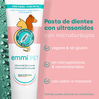 El juego básico emmi-pet PRO contiene dos cabezales de cepillo especialmente desarrollados (1 grande, 1 pequeño), que son adecuados tanto para perros pequeños como grandes. Con la pasta de dientes ultrasónica emmi-pet, libre de dióxido de titanio y parabenos, el cuidado dental es aún más seguro y suave.