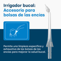 Adecuado para la limpieza de la bolsa periodontal, se inyecta en áreas específicas debajo del espacio de la encía. La columna de agua pulsada penetra profundamente en la bolsa periodontal/área subgingival. La boquilla suave y fina puede eliminar las bacterias dañinas en la bolsa periodontal/6-7 mm debajo de la encía. El flujo de agua pulsada masajea las encías de manera agradable.