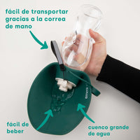 ¿También te gustaría llevar comida? ¡No hay problema con nuestra botella para perros 2 en 1 con recipiente para comida integrado!