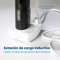 El emmi-dent Metallic tiene una duración de batería óptima. Con un uso regular de 2 a 3 veces al día, el Metallic puede durar hasta 12 días antes de necesitar recargarse. Esta batería de larga duración (iones de litio) ofrece comodidad y uso ininterrumpido y elimina la necesidad de cargas frecuentes.