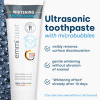 Die speziell entwickelte Ultraschall Zahnpasta verstärkt den Reinigungseffekt zusätzlich. Sie enthält Mikrobläschen, die durch Ultraschallwellen aktiviert werden und einen Sog-Effekt erzeugen. Dieser löst Plaque und Bakterien selbst an schwer zugänglichen Stellen. Wir empfehlen die Verwendung von Ultraschall Zahnpasta für ein optimales Reinigungsergebnis.