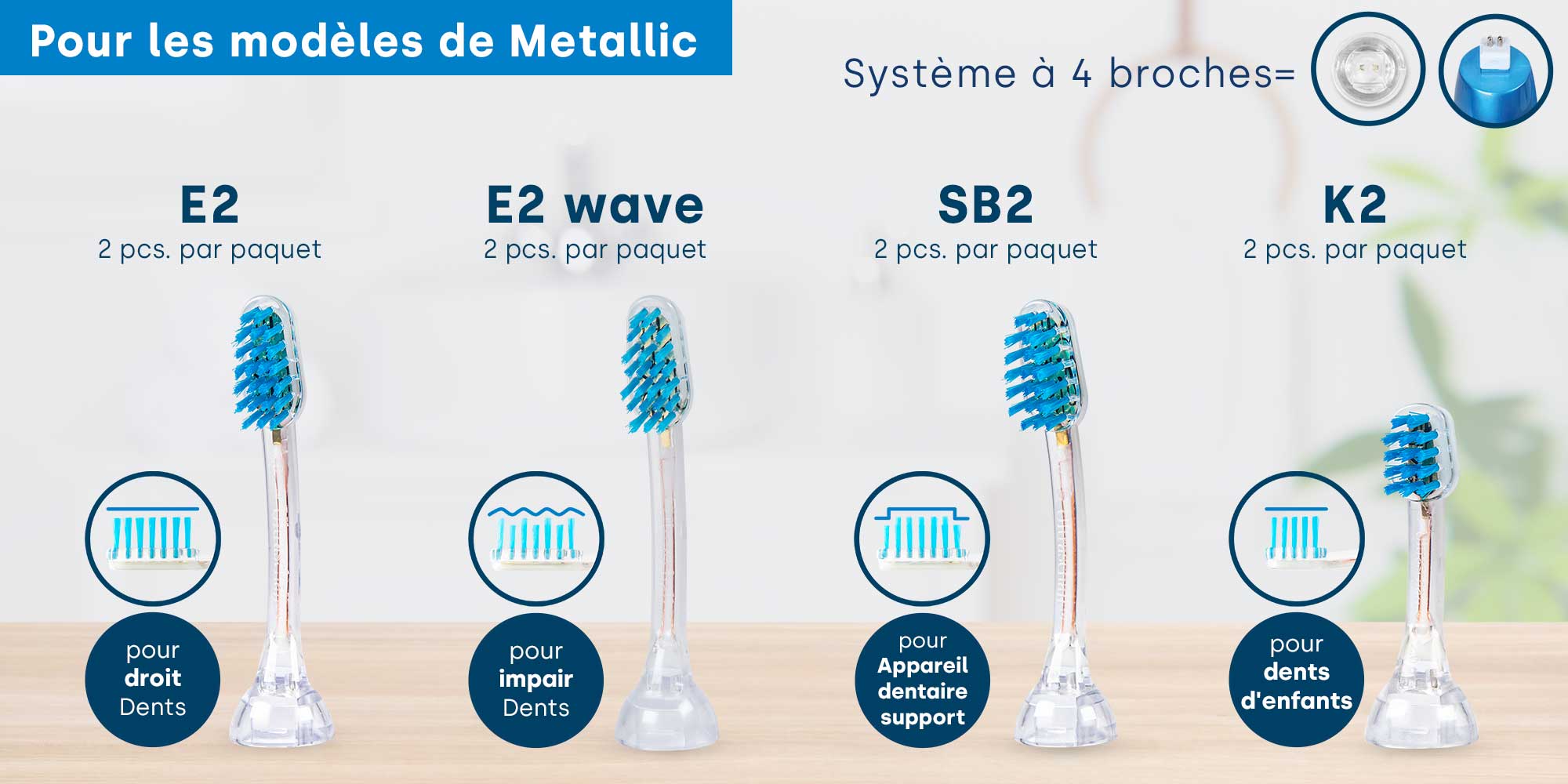 Les propriétaires d'une brosse à dents à ultrasons emmi-dent Metallic, GO ou Professional devraient choisir des têtes de brosse avec un système à 2 broches, qui s'adapte parfaitement à ces modèles. Sont disponibles :