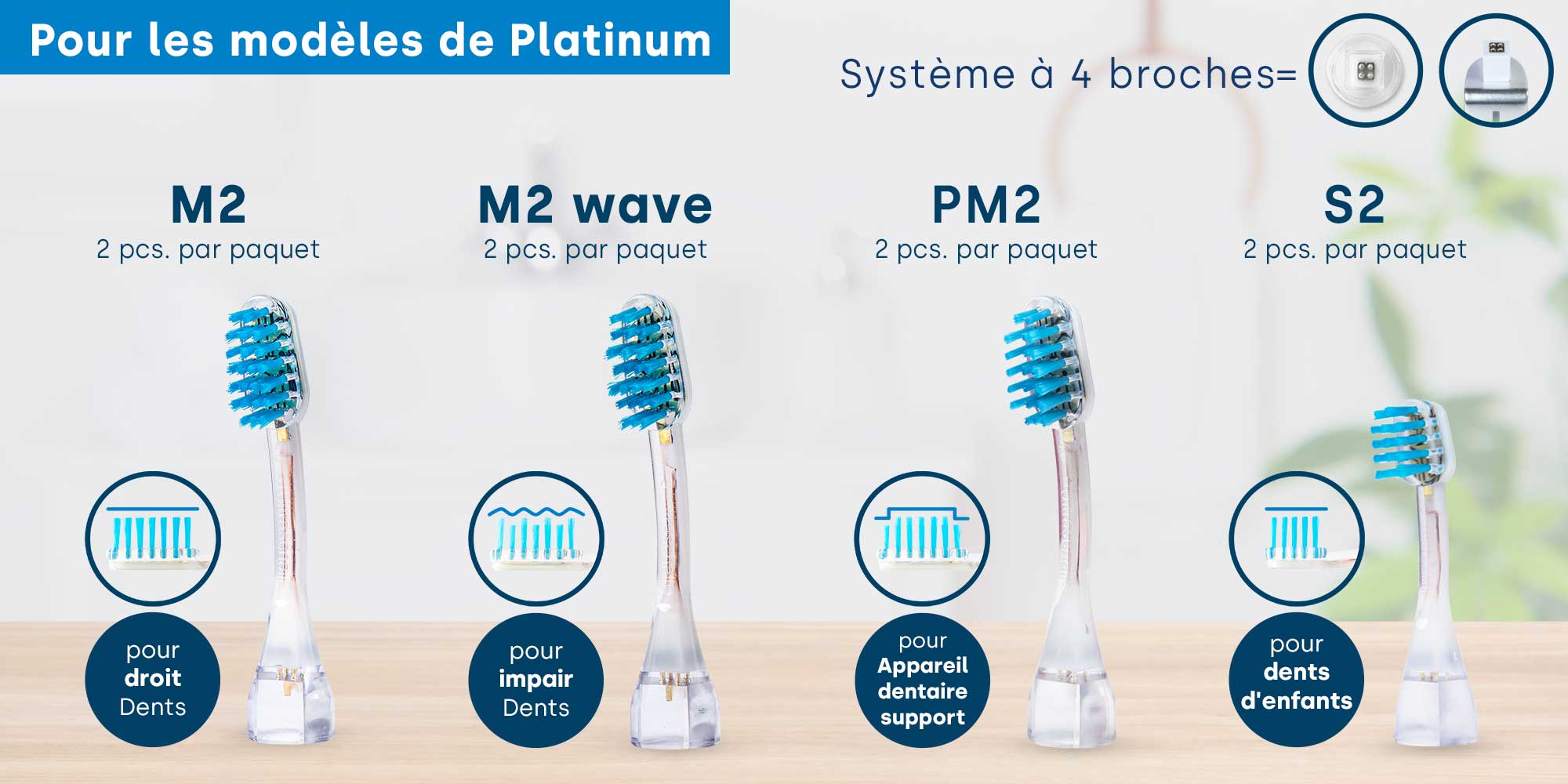 Pour les modèles Platinum, vous avez besoin de nos têtes de brosse à 4 broches, telles que les modèles M2, M2 Wave, S2 et PM2. Les utilisateurs des modèles Metallic , GO ou Professional doivent choisir les têtes de brosse à 2 broches telles que E2, E2 Wave, SB2 ou K2.