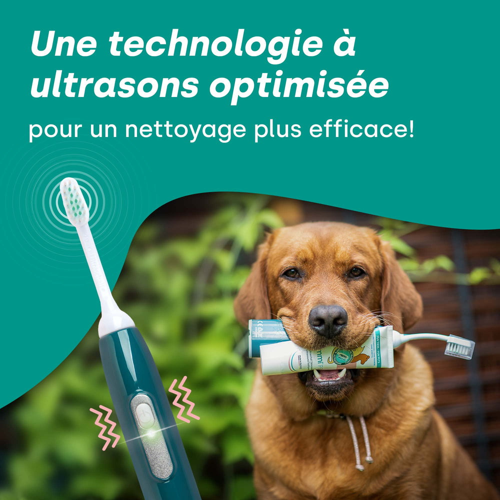 La brosse à dents à ultrasons améliorée élimine non seulement en profondeur la plaque dentaire et le biofilm, mais réduit également la gingivite et renforce durablement les gencives de votre animal. Grâce à la technologie optimisée, le nettoyage est encore plus efficace – sans aucun frottement.