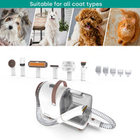 Notre appareil dispose de trois niveaux d'aspiration différents, à savoir 3 KPA, 7 KPA et 10 KPA. Le niveau d'aspiration le plus bas convient aux animaux sensibles et réduit la réaction de sursaut pendant l'utilisation. Vous pouvez choisir différents niveaux d'aspiration en fonction de la fourrure de votre animal pour assurer un nettoyage plus efficace de tous les types de poils. Outre la tondeuse, notre appareil est équipé de 5 types différents de brosses professionnelles, dont 1x tondeuse, 1x peigne de toilettage, 1x peigne lisseur, 1x brosse plate 2 en 1, 1x brosse à rouleau pour poils d'animaux et 1x brosse de massage. Ils conviennent à différents types et longueurs de pelage chez les chiens et les chats.