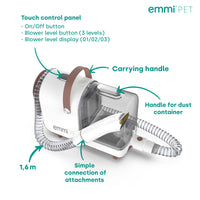Appareil tout-en-un : Emmi-pet Grooming Kit Home combine tondeuse, peigne et aspirateur en un seul appareil. La conception unique vous permet de couper et d'aspirer les cheveux en même temps, vous n'aurez donc plus jamais à vous soucier des cheveux rebelles. Cela rend les soins apportés à votre animal de compagnie simples et efficaces.