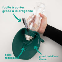 Souhaitez-vous également emporter de la nourriture avec vous ? Aucun problème avec notre gourde pour chien 2 en 1 avec récipient pour nourriture intégré !