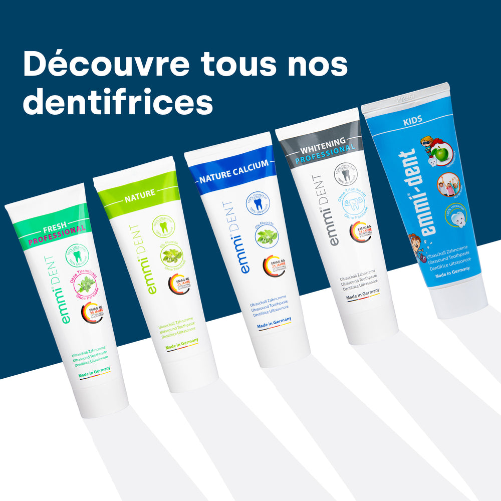 Le dentifrice à ultrasons emmi-dent Kids offre des soins doux et adaptés aux enfants, spécialement adaptés aux besoins des dents sensibles des enfants. Grâce à sa formule douce, il nettoie en douceur et favorise le maintien d'une flore buccale saine. Ayez l’esprit tranquille en sachant que vous choisissez les meilleurs soins pour le sourire radieux de votre enfant.