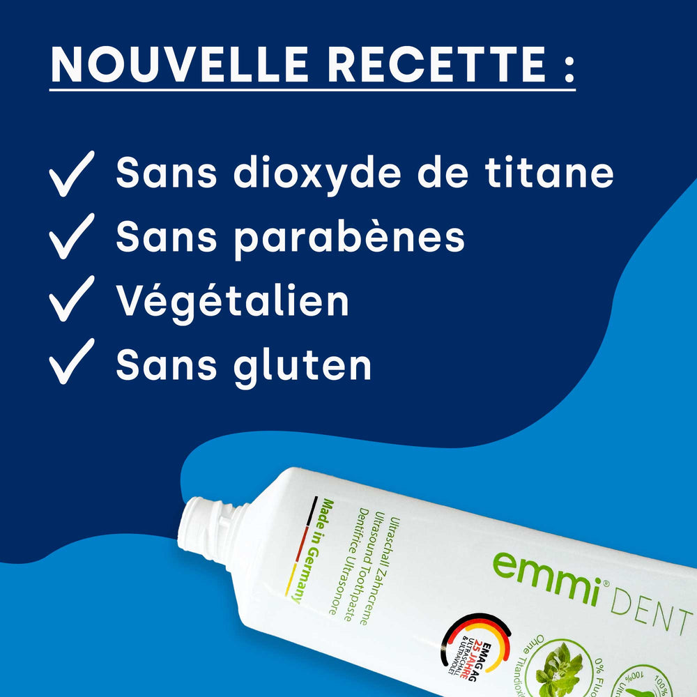 Chez emmi-dent nous attachons une grande importance à la qualité et au naturel. Notre dentifrice à ultrasons Nature contient des ingrédients naturels soigneusement sélectionnés qui prennent soin et protègent efficacement vos dents. Faites confiance à emmi-dent et profitez des bienfaits de soins dentaires de haute qualité sans fluor ni dioxyde de titane.