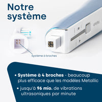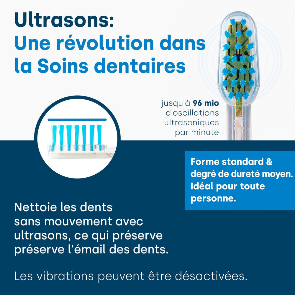 - Nettoyage en profondeur : la technologie ultrasonique élimine la plaque dentaire et les bactéries sans brossage mécanique.