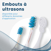 Les soins dentaires avec des brosses à dents conventionnelles se limitent aux zones de la bouche atteintes par la brosse à dents rotative ou sonique. Contrairement aux brosses à dents électriques classiques, la brosse à dents à ultrasons fonctionne totalement sans pression en transmettant des vibrations. Cela signifie que toute la cavité buccale est soigneusement nettoyée.