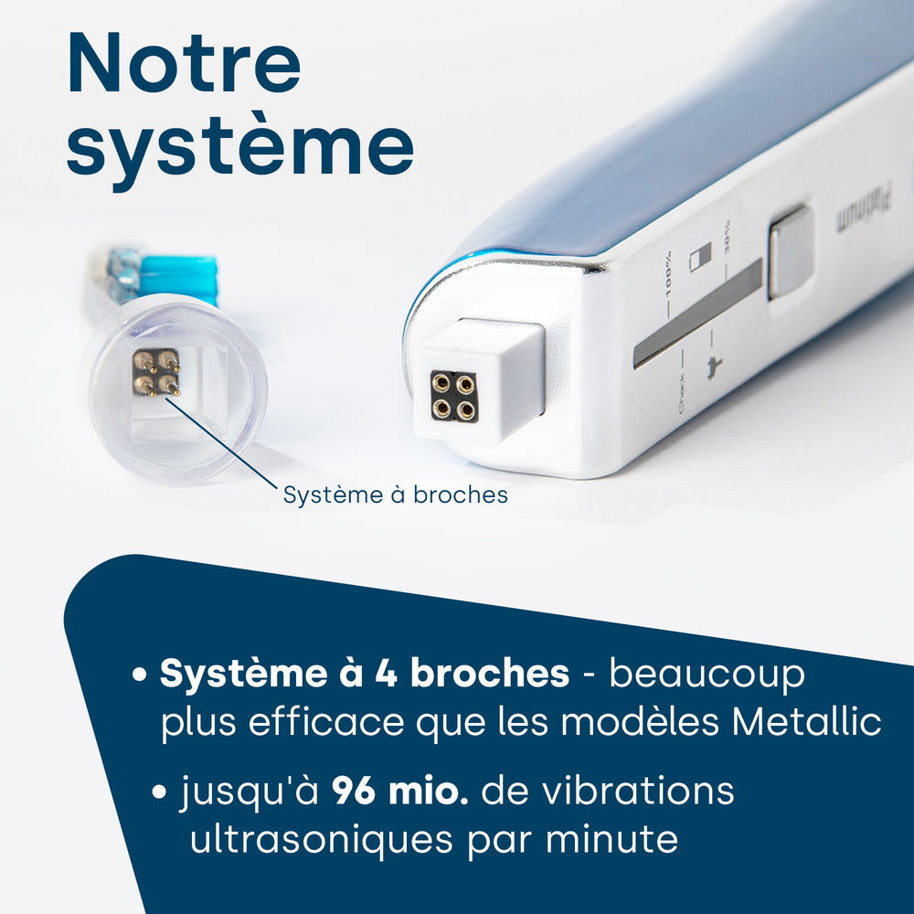 Les modèles Platinum utilisent une synchronisation optimisée grâce à l'intégration d'un système à 4 broches. Cette amélioration rend la technologie à ultrasons beaucoup plus efficace par rapport aux modèles emmi-dent Metallic et Go. Le timing amélioré permet une action de nettoyage plus efficace et plus puissante, garantissant une élimination complète de la plaque dentaire et une hygiène bucco-dentaire.