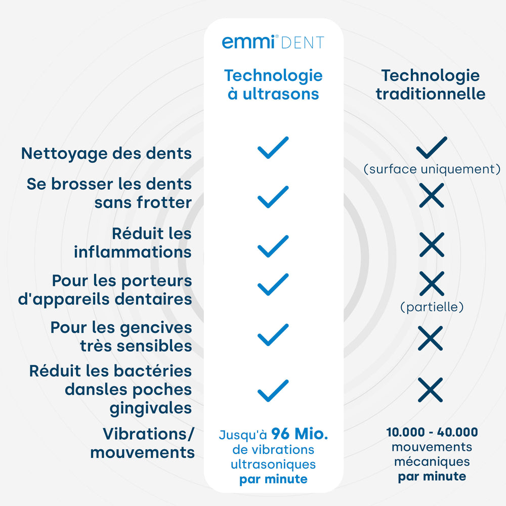 La technologie des ultrasons s’est avérée efficace dans le nettoyage professionnel des dents chez le dentiste. On utilise un ultrason « dur », qui a une basse fréquence et une puissance élevée. Les dentistes utilisent cette méthode avec succès depuis de nombreuses années pour éliminer le tartre et d’autres contaminants. La brosse à dents à ultrasons permet également une utilisation quotidienne de la technologie ultrasonique à la maison. L’innovant emmi-dent utilise des ultrasons « doux » à haute fréquence et à faible puissance.