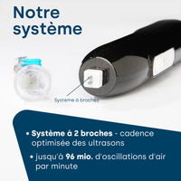 Les ultrasons réduisent les bactéries, même dans les poches des gencives, réduisent la mauvaise haleine et atteignent également les endroits difficiles d'accès : espaces interdentaires, réduction des bactéries, pour les porteurs d'appareils orthodontiques, d'implants, etc....