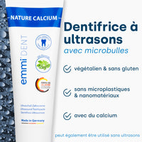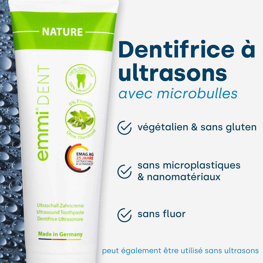 L'emmi-dent Metallic utilise un dentifrice ultrasonique spécial qui contient les microbulles nécessaires, qui sont environ 1000 fois plus petites que les bulles de dentifrice classiques. Ces microbulles sont ajoutées lors d’une étape supplémentaire du processus de production pour garantir une expérience de nettoyage optimale – retrouvez l’étude sur leur existence ici. Considérez les cinq différentes options de dentifrice disponibles pour emmi-dent et leurs avantages et caractéristiques respectifs.