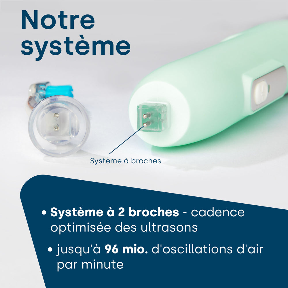 Les soins dentaires avec des brosses à dents conventionnelles se limitent aux zones de la bouche atteintes par la brosse à dents rotative ou sonique. Contrairement aux brosses à dents électriques classiques, la brosse à dents à ultrasons fonctionne totalement sans pression en transmettant des vibrations. Cela signifie que toute la cavité buccale est soigneusement nettoyée.