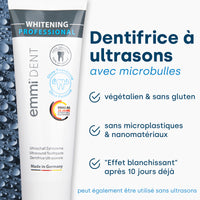 L'emmi-dent Metallic utilise un dentifrice ultrasonique spécial qui contient les microbulles nécessaires, qui sont environ 1000 fois plus petites que les bulles de dentifrice classiques. Ces microbulles sont ajoutées lors d’une étape supplémentaire du processus de production pour garantir une expérience de nettoyage optimale – retrouvez l’étude sur leur existence ici. Considérez les cinq différentes options de dentifrice disponibles pour emmi-dent et leurs avantages et caractéristiques respectifs.