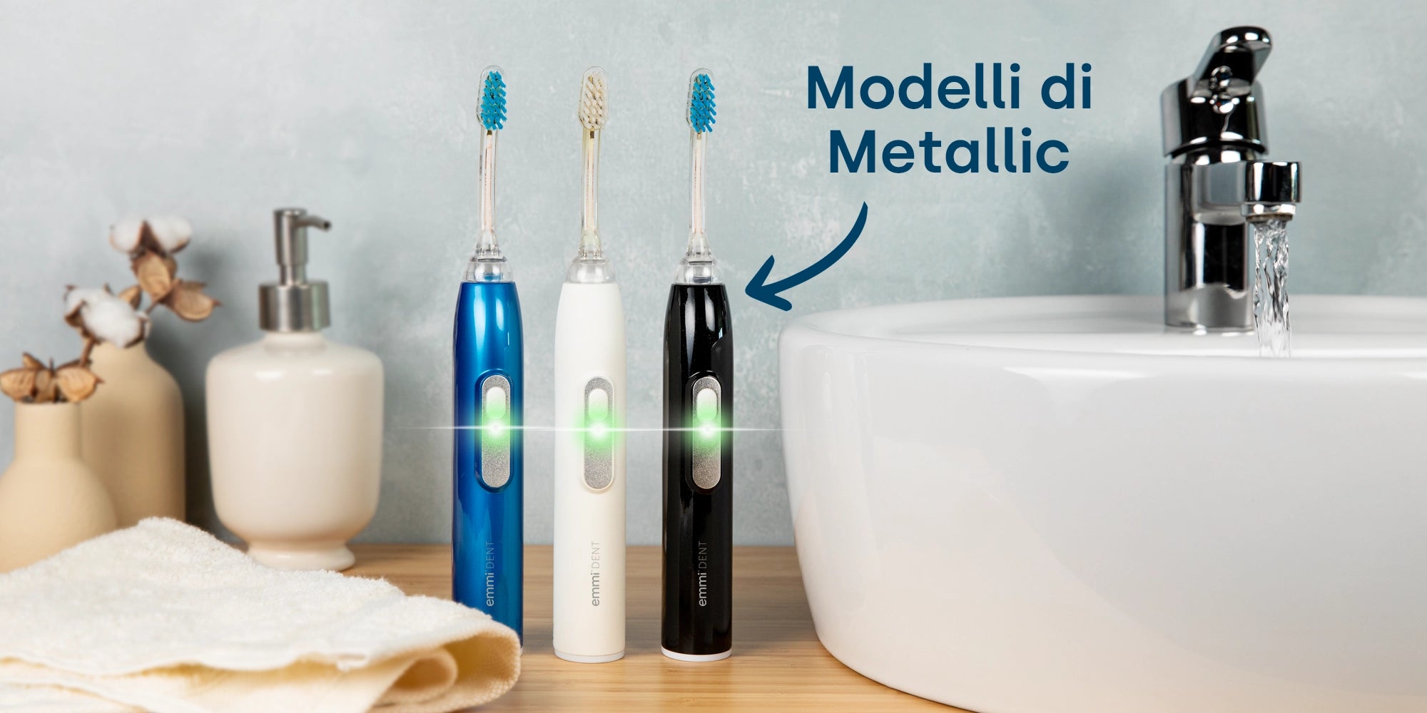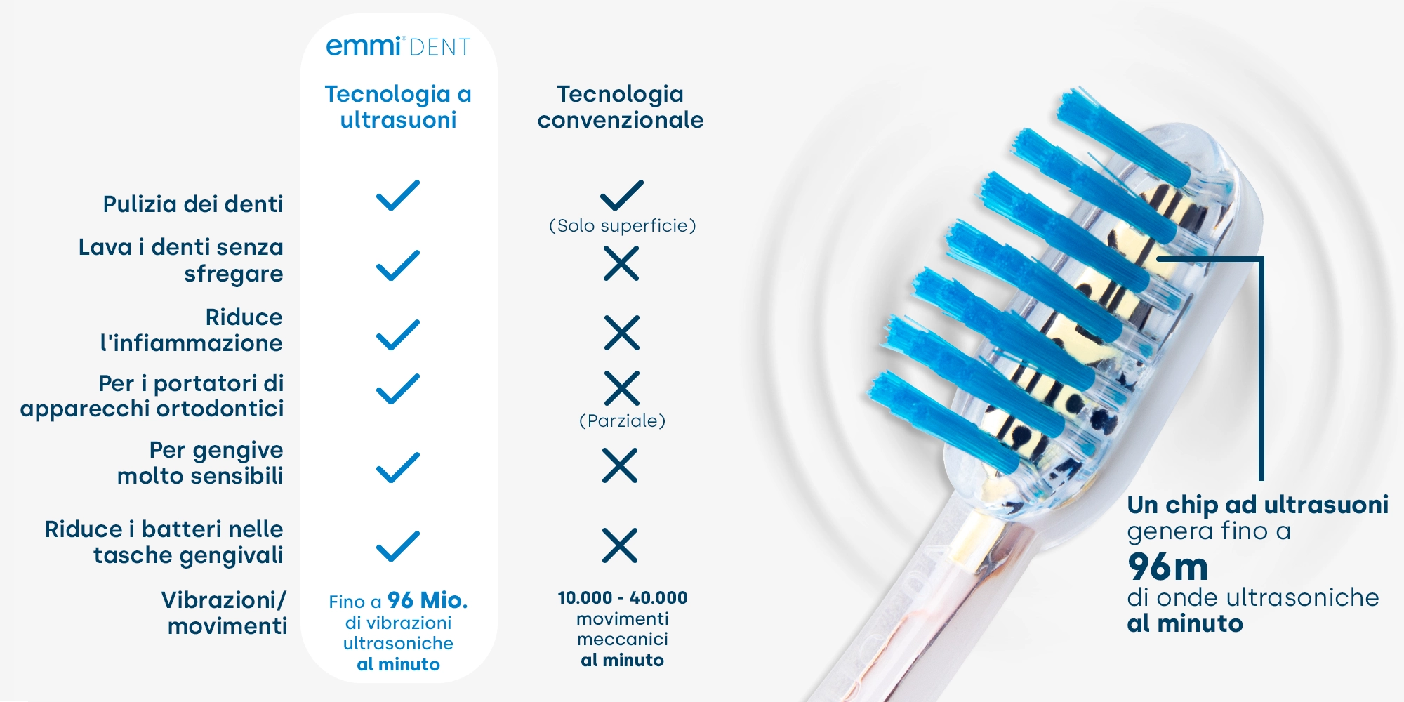Gli spazzolini ad ultrasuoni Emmi-Dent funzionano senza movimento meccanico. L'accessorio dello spazzolino ultrasonico ospita il disco piezoelettrico ultrasonico brevettato. L'innovativa testina dello spazzolino converte l'energia elettrica in energia ultrasonica, che viene poi trasferita ai denti e alle gengive tramite speciali dentifrici a ultrasuoni e saliva. Il trasmettitore ultrasonico viene stimolato a vibrare (fino a 96 milioni di vibrazioni multifrequenza). Queste vibrazioni rompono la struttura delle microbolle contenute nel dentifricio, che poi collassano e creano aspirazione. Questo effetto porta alla rimozione del biofilm e della placca, una rivoluzione nel normale processo di spazzolatura dei denti.