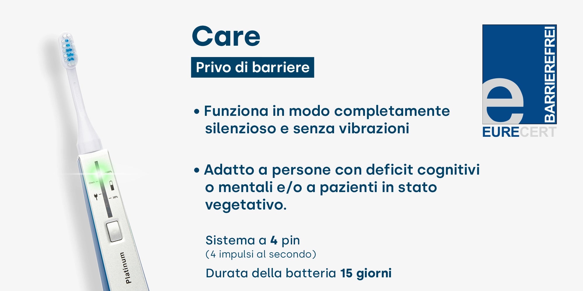 Il modello Care , invece, è concepito come uno spazzolino ultrasonico senza barriere, che funziona in totale assenza di rumore e vibrazioni. È quindi ideale per le persone con disabilità cognitive o per i pazienti in stato vegetativo. Grazie al sistema a 4 pin (quattro impulsi al secondo) e alla durata della batteria di 15 giorni, stabilisce nuovi standard in termini di assistenza e supporto.