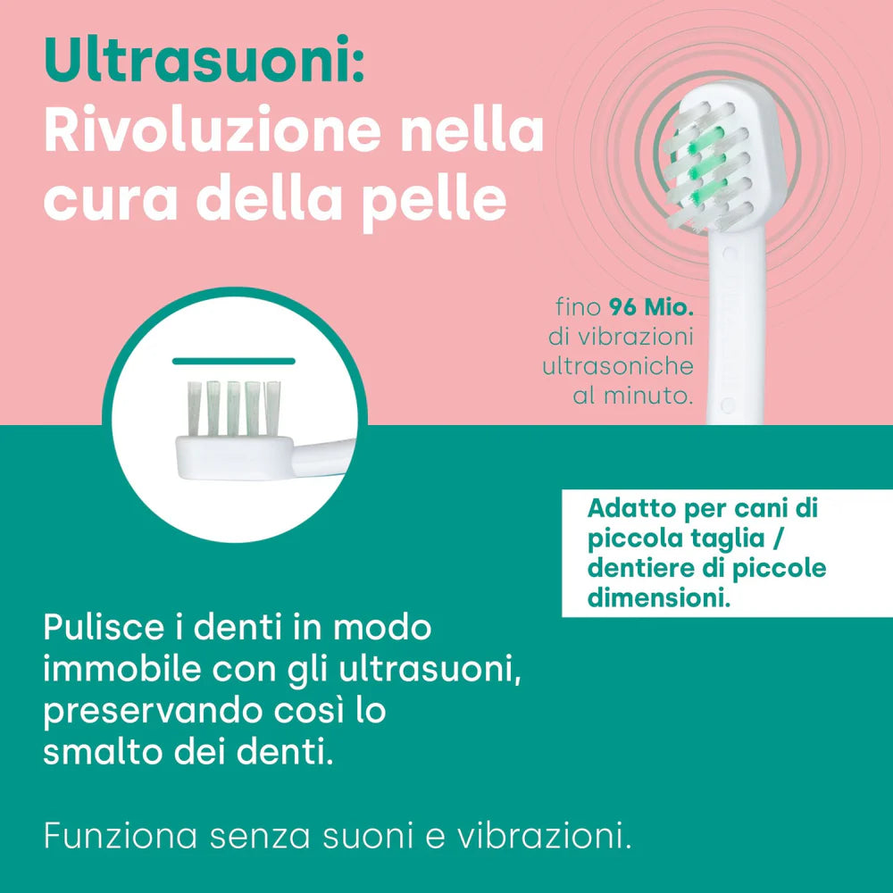La testina della spazzola ultrasonica Emmi-Pet sfrutta i vantaggi della tecnologia ultrasonica brevettata per raggiungere anche le aree difficili da raggiungere, che le setole tradizionali hanno difficoltà a pulire. Grazie a questa tecnologia rivoluzionaria, la placca e le impurità vengono rimosse in modo delicato ed efficace, favorendo la salute dentale del tuo animale domestico e prevenendo possibili malattie.