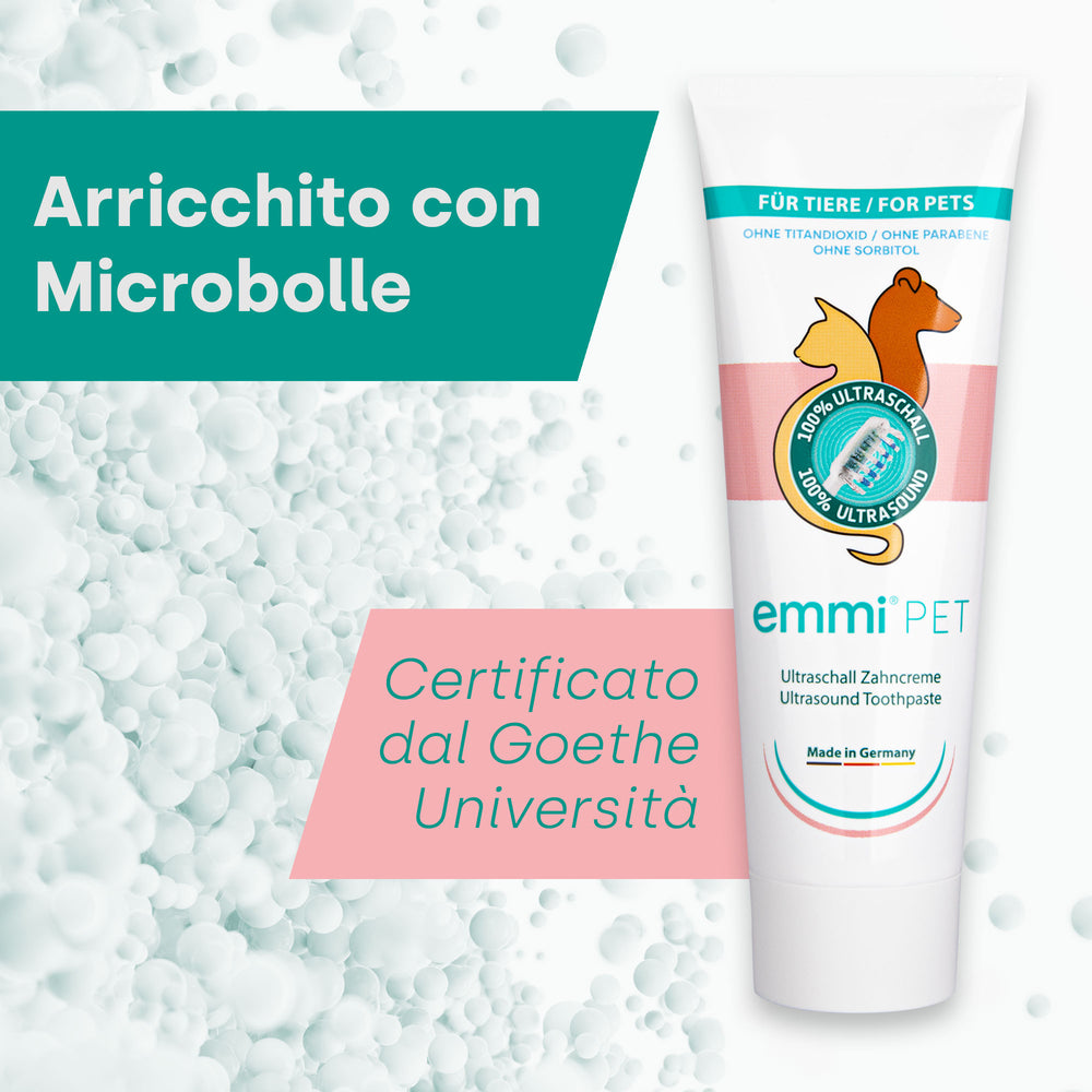 Il dentifricio ultrasonico emmi-pet per animali offre numerosi vantaggi che lo rendono un'ottima scelta per la cura dentale del tuo animale domestico: Pulizia delicata senza abrasione: grazie agli ultrasuoni non è più necessario spazzolare i denti in modo aggressivo. Il valore RDA (abrasione relativa della dentina) è 0, il che significa che il dentifricio è particolarmente delicato sullo smalto e sulle gengive del tuo animale domestico. Rimozione efficace di biofilm e batteri: la tecnologia a microbolle garantisce la rimozione anche della placca e dei batteri più ostinati, senza sollecitare meccanicamente i denti. Prevenzione delle malattie dei denti e delle gengive: una pulizia delicata ma accurata preserva le funzioni protettive naturali dei denti, riducendo significativamente il rischio di malattie dei denti e delle gengive. Combattere l'alito cattivo: l'uso regolare del dentifricio Emmi-Pet aiuta a prevenire l'alito cattivo riducendo il numero di batteri che causano cattivi odori.