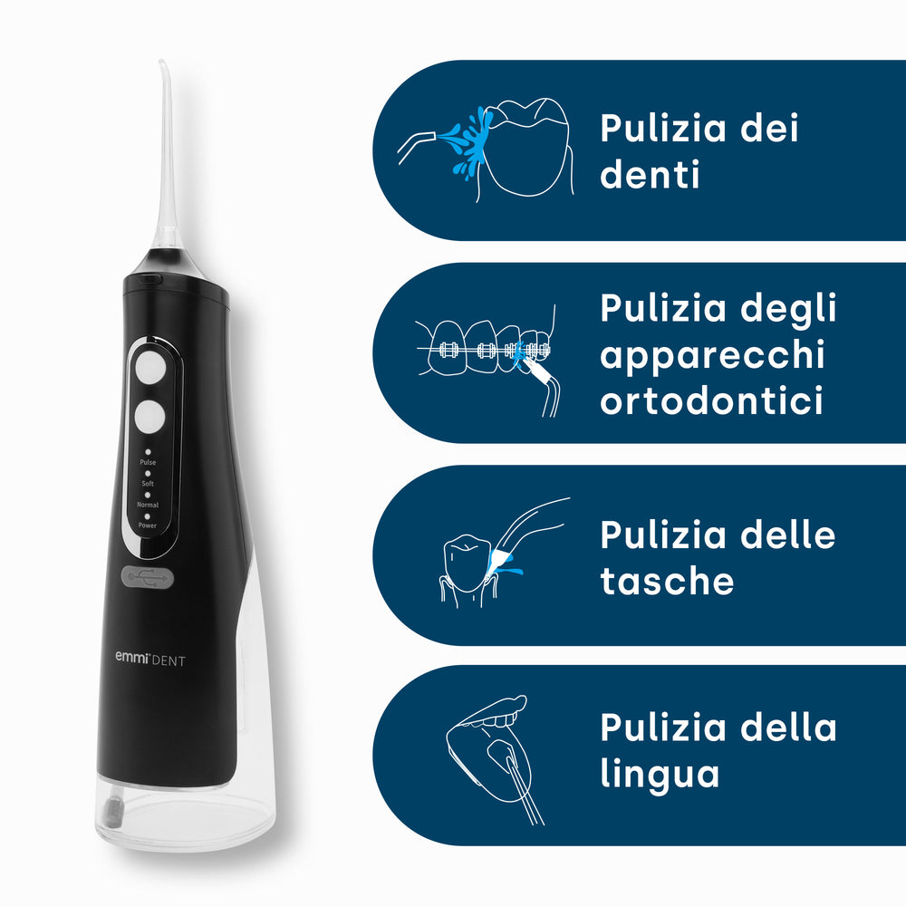 L'idropulsore emmi-dent si rivela indispensabile per un'igiene orale completa, oltre alla cura quotidiana dei denti con lo spazzolino. Progettato per pulire a fondo e delicatamente gli spazi tra i denti, spesso trascurati durante lo spazzolamento tradizionale, supera l'efficacia del filo interdentale, soprattutto nei denti affollati o nelle aree difficili da raggiungere. Dotato di quattro modalità di pulizia (impulso, delicato, normale e forte) e di quattro ugelli di ricambio, l'idropulsore si adatta alle esigenze individuali, anche se si consiglia di sostituire regolarmente gli ugelli ogni tre mesi. La versatilità dell'idropulsore emmi-dent è dimostrata dalla sua capacità non solo di pulire a fondo i residui di cibo e la placca tra i denti, ma anche di soddisfare esigenze particolari come la pulizia attorno ad apparecchi ortodontici e impianti. È un valido aiuto per le persone con gengive sensibili, poiché garantisce una pulizia delicata ma profonda, prevenendo così i problemi gengivali. Inoltre, favorisce la salute delle gengive attraverso il massaggio, che favorisce la circolazione sanguigna, e contribuisce a mantenere l'alito fresco rimuovendo efficacemente i batteri dalla lingua. Grazie alla capacità di pulire le tasche parodontali e di combattere efficacemente la placca, l'irrigatore orale emmi-dent riduce al minimo il rischio di malattie gengivali e carie, il che lo rende un utile complemento allo spazzolino a ultrasuoni per garantire un'igiene orale ottimale.