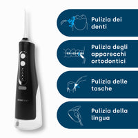L'idropulsore è impermeabile secondo lo standard IPX7 e può essere utilizzato a casa o in viaggio. Il serbatoio integrato da 300 ml può essere facilmente rimosso per la pulizia. Anche l'ugello può essere facilmente rimosso per sostituire gli accessori.