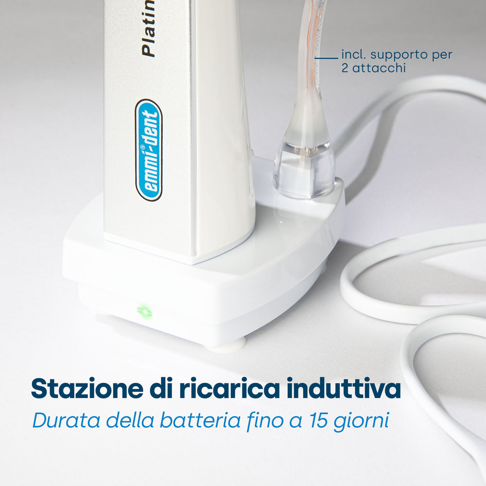 Grazie alla tecnologia a ultrasuoni senza abrasione, emmi-dent PlatinumCAM è particolarmente indicata per persone con gengive sensibili, impianti, apparecchi ortodontici o malattie dentali come la parodontite. Le delicate vibrazioni puliscono delicatamente senza irritare denti o gengive. In questo modo i tuoi denti resteranno sani senza danneggiarne lo smalto.