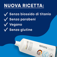 Scopri il mondo migliorato del dentifricio sbiancante emmi-dent : ora senza biossido di titanio e parabeni! Sperimenta lo stesso potente effetto sbiancante, ma con una formula ancora più naturale. L'assenza di biossido di titanio rende il nostro dentifricio delicato e delicato, perfetto per denti bianchi e splendenti senza compromessi. Godetevi il meglio della cura dentale naturale e un sorriso radioso!
