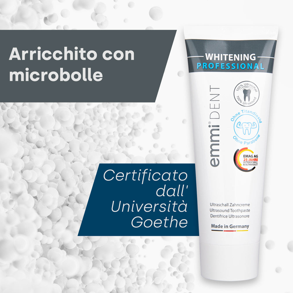 Il dentifricio sbiancante a ultrasuoni Emmi-Dent ti aiuta a ottenere un sorriso bianco smagliante senza i problemi dei metodi convenzionali. Grazie all'avanzata tecnologia ultrasonica abbinata allo spazzolino a ultrasuoni, rimuove delicatamente le macchie ostinate e fa brillare i denti. Attirerai con ansia gli sguardi di ammirazione quando sfoggerai il tuo sorriso radioso. Può essere utilizzato anche con lo spazzolino a ultrasuoni.