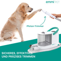Das Grooming Kit beinhaltet nicht nur einen Staubsauger, sondern auch eine Schermaschine, um deinen Hund oder deine Katze zu Hause effektiv zu pflegen. Das macht das emmi-pet Grooming Kit zum besten Tierhaarstaubsauger mit Schermaschine im Vergleich zu anderen Modellen. Für diejenigen, die eine noch umfassendere Pflege benötigen, bietet die Pro-Version zusätzlich einen speziellen Nagelschneider und Pfotentrimmer, ideal für eine präzise Pfoten- und Nagelpflege.