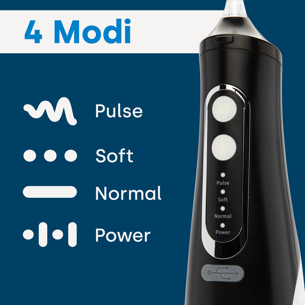 Impuls, sanft, normal und stark – Wähle den Wasserdruck, der zu deinen Zähnen und Zahnfleisch passt. Der Normal-Modus sorgt für einen effizienten Wasserstrahl zur täglichen Zahnspülung morgens und abends. Der Soft-Modus sorgt für eine sanfte, aber dennoch effektive Reinigung.