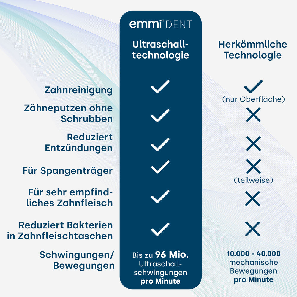 Zu den elektrischen Zahnbürsten zählen sowohl Rotationszahnbürsten als auch Schallzahnbürsten und Ultraschallzahnbürsten. Während erstere meist über runde Bürsten verfügen, die sich abwechselnd von links nach rechts drehen, sind Schallzahnbürsten mit länglichen, vibrierenden Köpfen ausgestattet. Mit 20.000 bis 40.000 Schwingungen pro Minute erreichen sie deutlich höhere mechanische Bewegungen als Rotationsbürsten. Ultraschallzahnbürsten übertreffen diese Leistung um ein Vielfaches und basieren zudem auf einer anderen Technologie. Während Rotations- und Schallzahnbürsten mit Hilfe von mechanischen Bewegungen den Biofilm entfernen, arbeitet die emmi-dent mit bis zu 96 Millionen Ultraschallschwingungen pro Minute und benötigt keine mechanischen Bewegungen für die Zahnreinigung. Somit liegt der entscheidende Unterschied in der Art der Zahnreinigung: Ebenso wie Handzahnbürsten reinigen auch Rotations- und Schallzahnbürsten den Zahn mechanisch. Diese sogenannte Makro-Reinigung birgt bei unsachgemäßer Benutzung der Zahnbürste ein Risiko für Verletzungen an Zahnfleisch und Zahnschmelz. Zusätzlich ist Ultraschall in der Lage, Entzündungen zu minimieren. Dies bestätigt unsere Studie. Die Zahnpflege beschränkt sich auf die Gebiete im Mund, die die Rotations- bzw. Schallzahnbürste erreichen. Im Gegensatz zu den herkömmlichen elektrischen Zahnbürsten, arbeitet die Ultraschallzahnbürste völlig ohne Druck mittels Übertragung von Schwingungen. So werden auch Bakterien in schwer erreichbaren Zahnzwischenräumen reduziert.